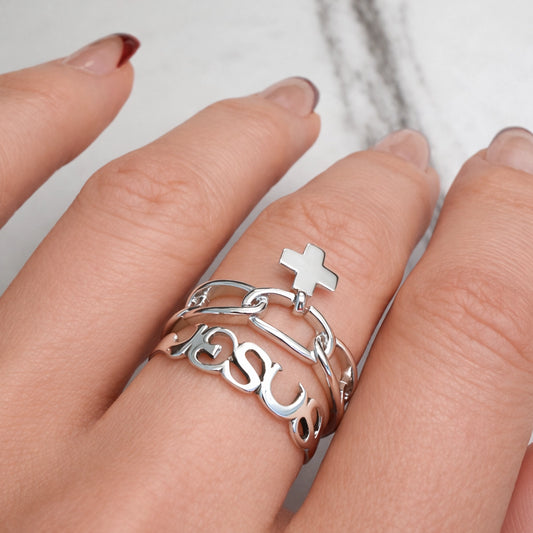 Christian Ring Set of Sacred Heart of Jesus Dangle Charm Ring and In the Name of Jesus Catholic Band Ring