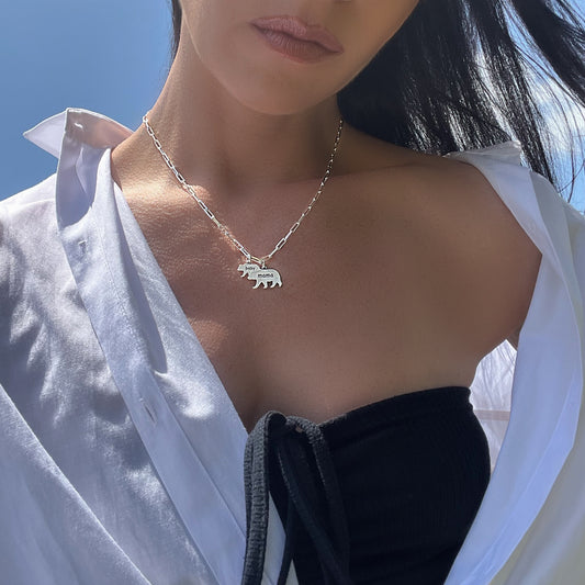 Mama and Baby Bear Engraved Charm Necklace on a Stylish Paperclip Chain