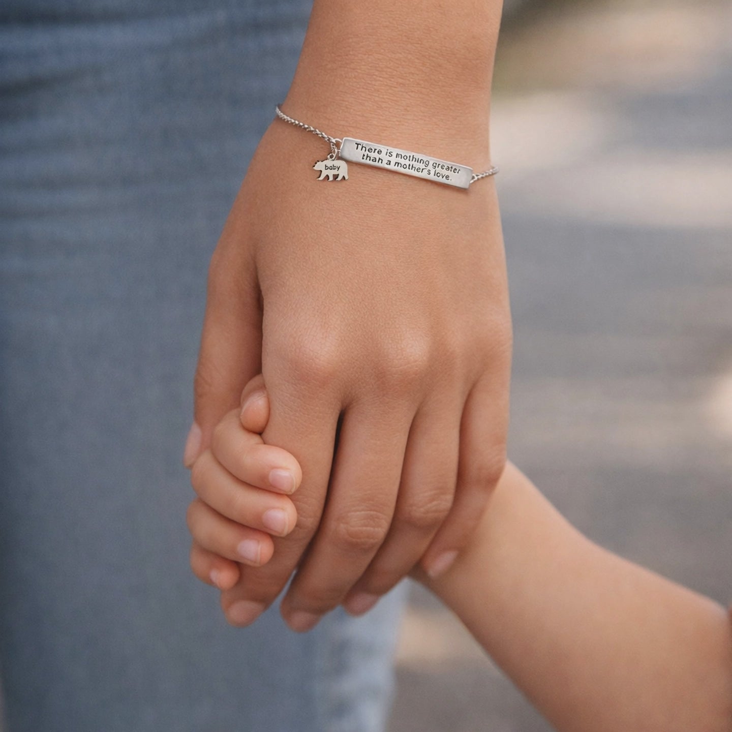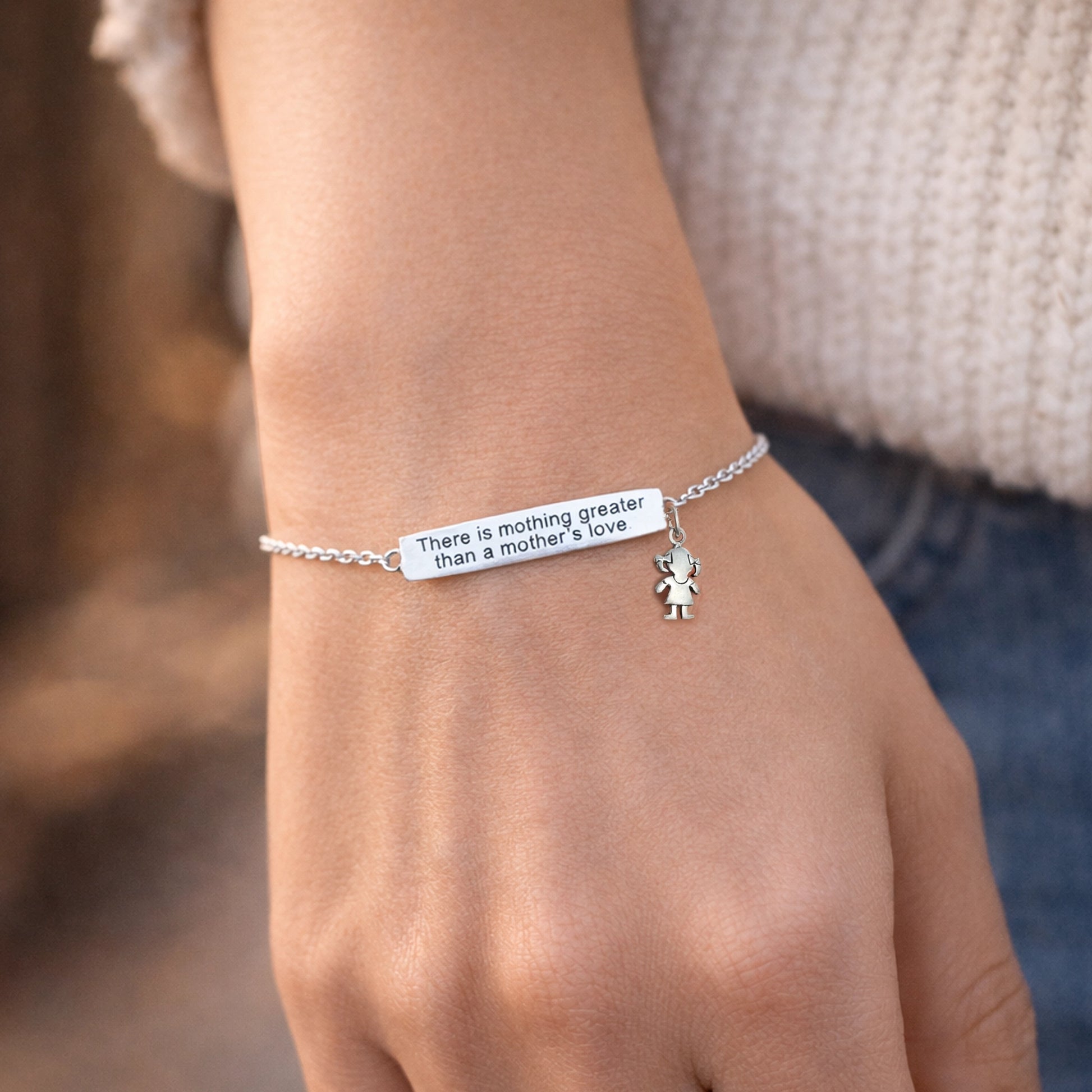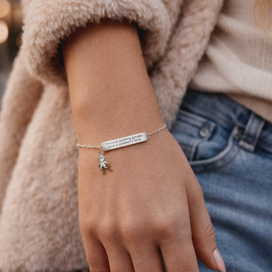 ¡Todas las mamás estarán felices de recibir nuestra Pulsera con Barra con Mensaje Sentimental Grabado! ¡Es el regalo perfecto para el Día de la Madre! La pulsera tiene una barra de 5,5 mm x 31,5 mm con el mensaje universal grabado "No hay nada más grande que el amor de una madre". Está hecha 100 % de plata de ley de alta calidad. También puedes personalizarla con dijes de osito.