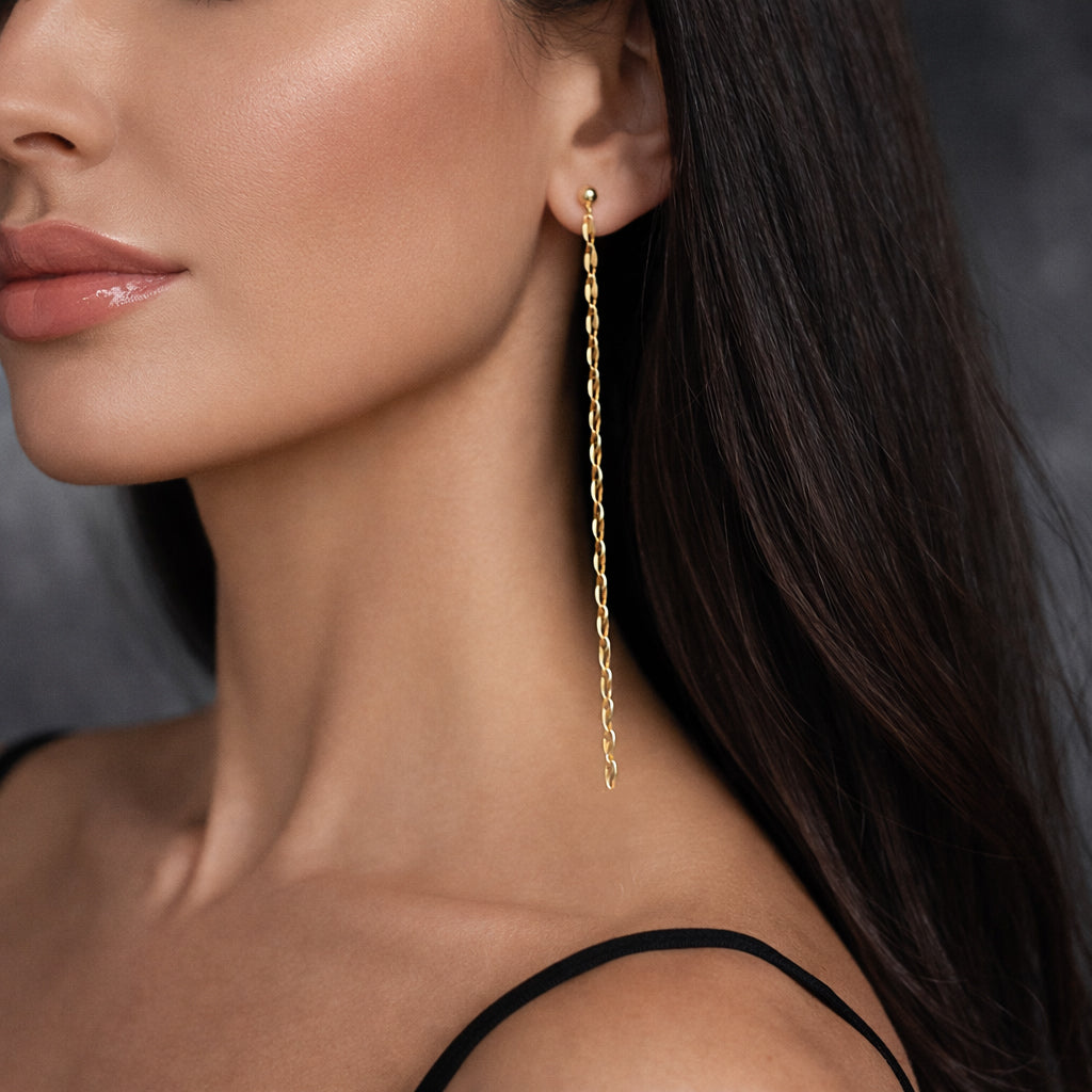 Te encantarán estos impresionantes aretes colgantes de cadena chapados en oro de 18k, diseñados para aportar una elegancia natural a tu estilo diario. Con un diseño moderno y alargado, son ligeros, cómodos y versátiles, ideales para combinar con atuendos casuales o formales. Perfectos para combinar con otros accesorios o para lucirlos solos, estos aretes son una adición imprescindible a tu colección de joyas. ¡Añade un toque de sofisticación atemporal a tu look hoy mismo!