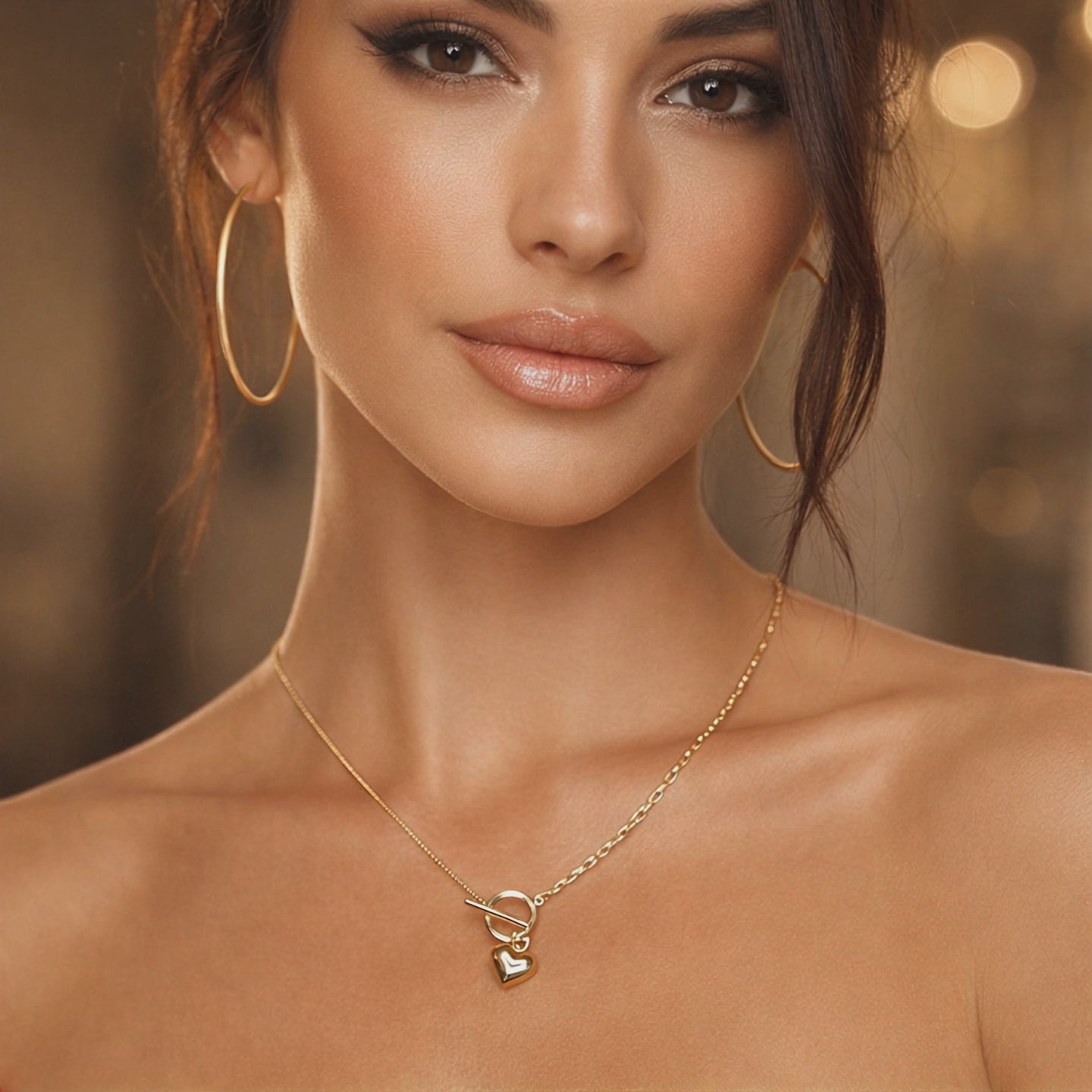 Este impresionante collar presenta un colgante de corazón 3D que cuelga de un eslabón circular, combinando elegancia con un diseño de cadena moderno. Una pieza versátil que añade un toque de amor y sofisticación a cualquier look.