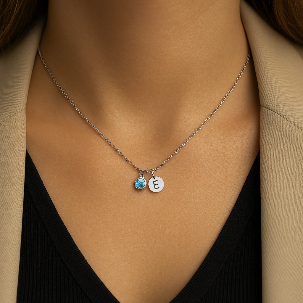 Collar solitario con piedra de nacimiento y dije de inicial redonda en plata de ley