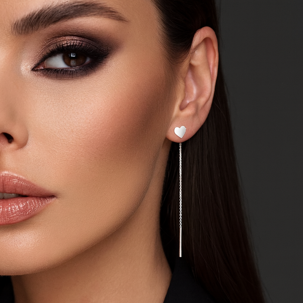 Sleek sterling silver heart threader earrings with a fine delicate chain and polished bar threader create an ultra-light long dangle that moves softly with every step. The minimalist heart earrings front keeps the look clean while the pull through chain makes them endlessly adjustable and comfortable. Designed for everyday wear, these silver earrings layer beautifully with studs or small hoops and read as refined minimalist earrings and dainty earrings in one - feather-light, lightweight, and easy to style for day or night. Comfortable enough to sleep in.