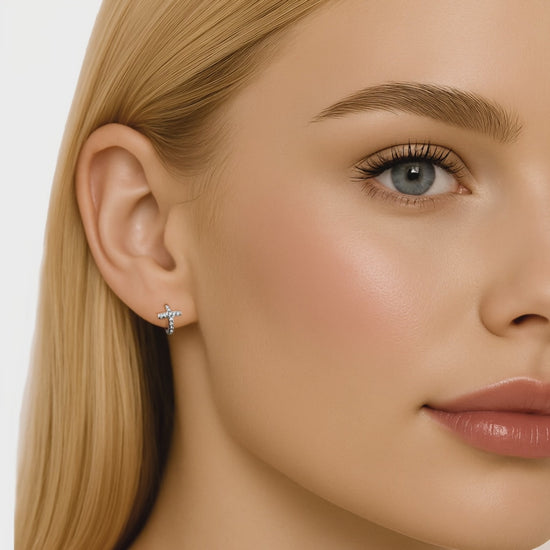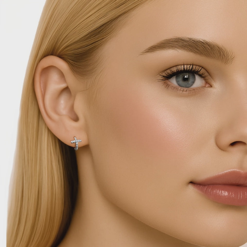Dale un toque de elegancia con nuestros pequeños aros con cruz pavé, con brillantes diamantes de imitación. Elaborados en plata de ley de alta calidad, estos aros con cruz son ligeros, cómodos y elegantes, perfectos para el día a día o para ocasiones especiales. Una pieza religiosa significativa y atemporal, el regalo perfecto para ella.