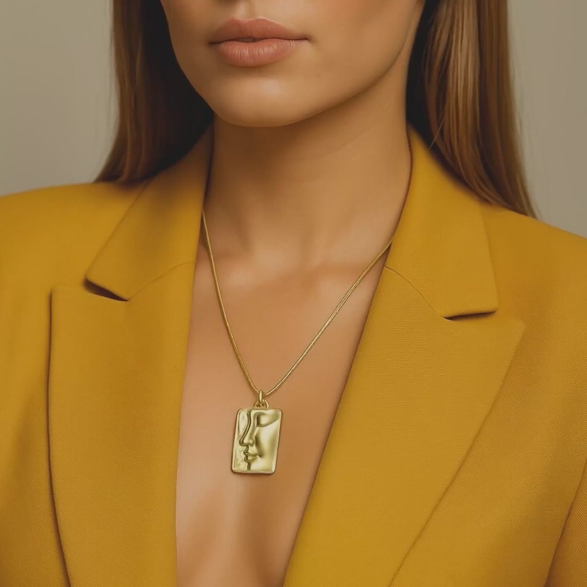 This Matte Gold Medallion Necklace features an abstract face square tag pendant suspended from a sleek snake chain. With its artistic design inspired by Picasso-style line art, this necklace combines modern minimalism with a bold statement look.