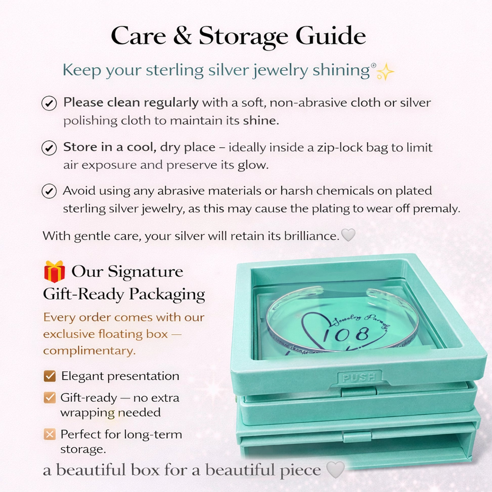 Please clean regularly with a soft, non-abrasive cloth or silver polishing cloth to maintain its shine. When not in use, store in a cool, dry place, preferably in an anti-tarnish pouch, lined jewelry box or ziplock bag. Avoid using any abrasive materials or harsh chemicals on plated sterling silver jewelry, as this may cause the plating to wear off prematurely. With gentle care, your silver will retain its brilliance.