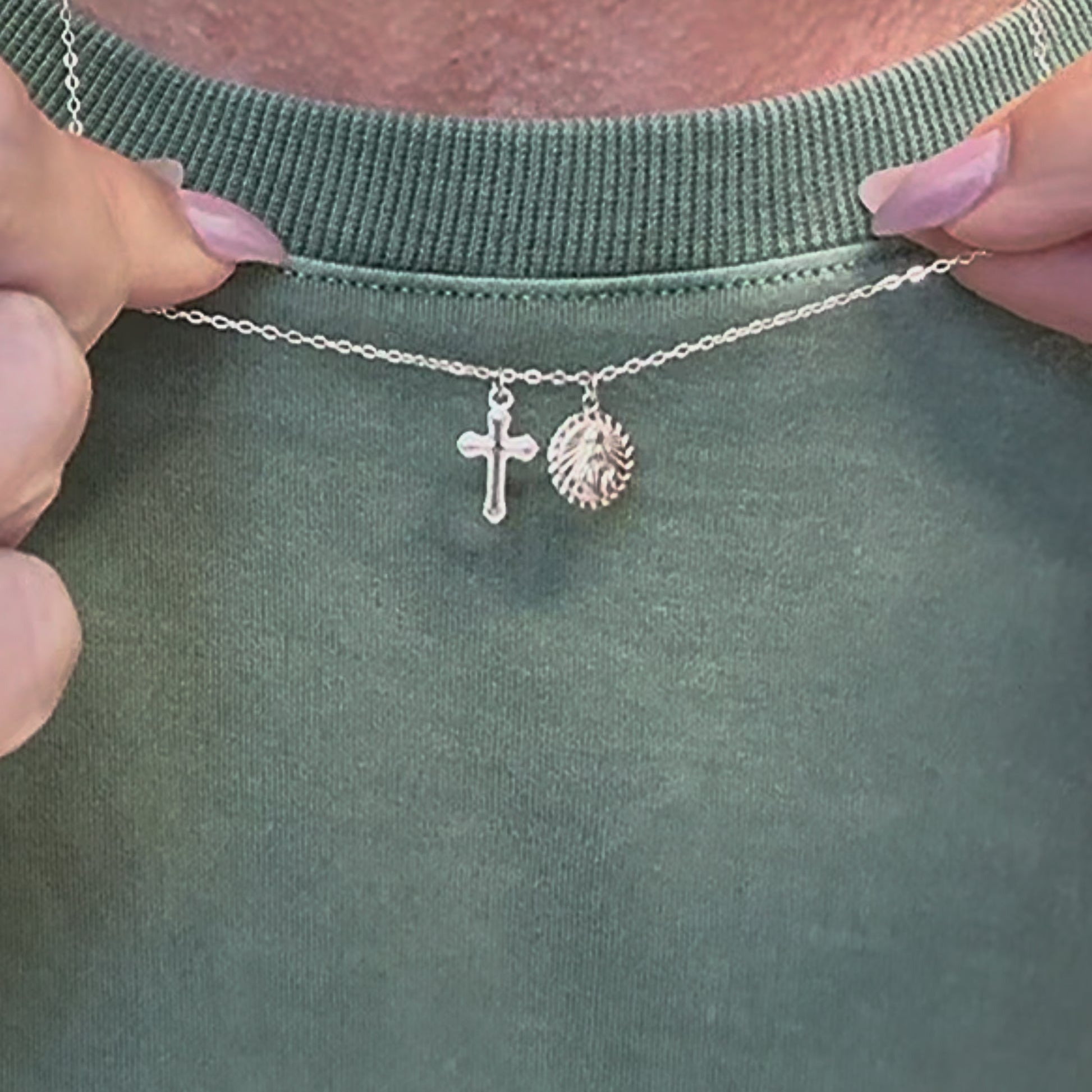 The first pendant is a round medallion depicting the Virgin Mary, radiating grace and serenity, surrounded by a sunburst design that symbolizes divine light. The second pendant is a classic plain cross, representing faith and devotion. This miraculous necklace is a perfect blend of style and spirituality, making it an ideal piece for daily wear or as a meaningful gift for your Christian friend, sister, daughter, goddaughter, mom or grandmom. You can also add an initial letter disc charm to make it special and unique!